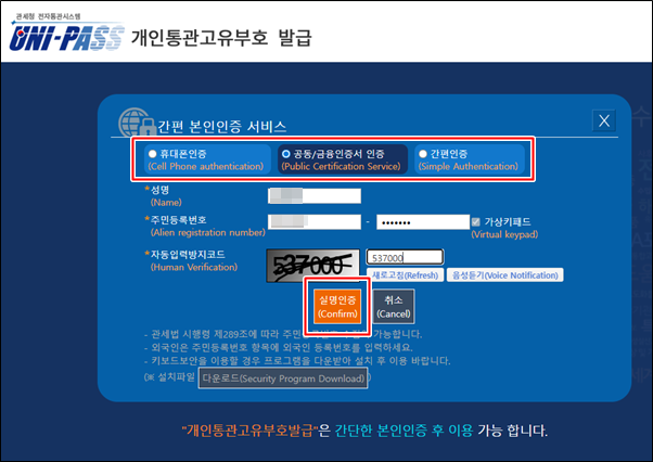 그러면 선택한 인증방법이 팝업으로 진행이 되고 실명 인증이 완료되면 조회화면으로 자동으로 이동합니다.