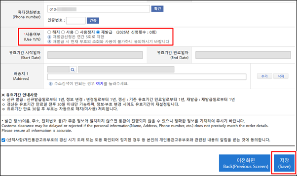 개인통관고유부호 발급기관 접속 -> 조회 화면 -> 수정 화면 -> 저장