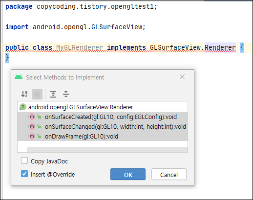 Google에 있는대로 MyGLRenderer.java 파일을 생성하고