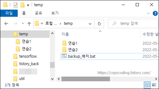 배치파일의 작동을 보면 먼저 복사할 위치에 폴더를 생성합니다(폴더가 있으면 생성안함).