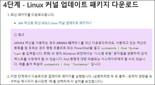 파란색 글씨의 [x64 머신용 최신 WSL2 Linux 커널 업데이트 패키지]를 클릭하면 설치파일이 다운로드 됩니다.