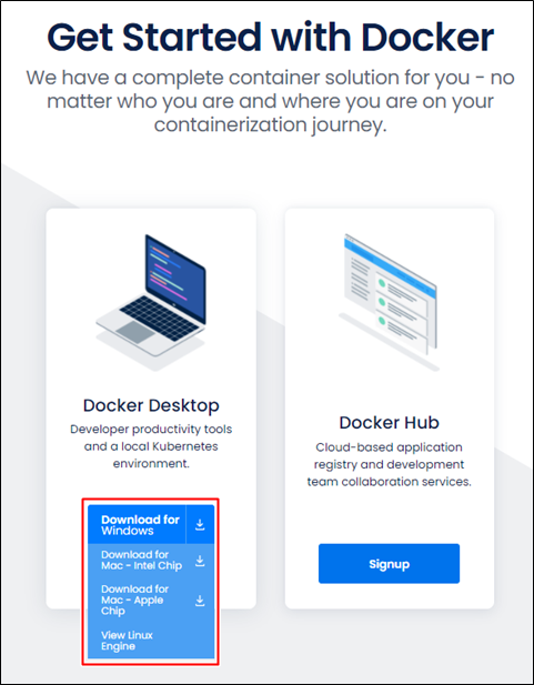 도커 사이트에 접속해서 [Get Started]를 선택 하거나 직접 get started 페이지로 이동을 합니다.