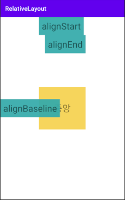 | <?xml version="1.0" encoding="utf-8"?> <RelativeLayout xmlns:android="http://schemas.android.com/apk/res/android" xmlns:tools="http://schemas.android.com/tools" android:layout_width="match_parent" android:layout_height="match_parent"> <TextView android:id="@+id/cntText" android:layout_width="wrap_content" android:layout_height="wrap_content" android:padding="50dp" android:textSize="30sp" android:layout_centerInParent="true" android:background="#F6D55C" android:text="중앙" /> <TextView android:id="@+id/alignStart" android:layout_width="wrap_content" android:layout_height="wrap_content" android:padding="10dp" android:textSize="30sp" android:layout_alignStart="@id/cntText" android:background="#E3AA" android:text="alignStart" /> <TextView android:layout_width="wrap_content" android:layout_height="wrap_content" android:padding="10dp" android:textSize="30sp" android:layout_below="@id/alignStart" android:layout_alignEnd="@id/cntText" android:background="#E3AA" android:text="alignEnd" /> <TextView android:layout_width="wrap_content" android:layout_height="wrap_content" android:padding="10dp" android:textSize="30sp" android:layout_below="@id/alignStart" android:layout_alignBaseline="@id/cntText" android:background="#E3AA" android:text="alignBaseline" /> </RelativeLayout> |