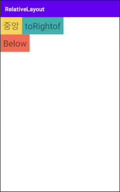 기준 View를 중심으로 추가되는 View의 위치를 위, 아래, 왼쪽, 오른쪽 등 상대적 위치에 위치 시키는 옵션 입니다. 상대적 위치의 설정 값으로 기준 View의 ID가 사용되므로 기준이 되는 View에는 꼭 아이디 값이 부여되어 있어야 합니다.