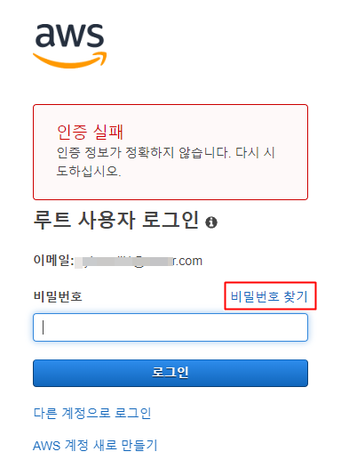 AWS를 자주 사용하지 않고 root 비밀번호가 자주 사용하지 않는 비밀번호이면 잊어버리는 경우가 발생합니다. 이때는 AWS에 등록해 놓은 메일주소와 비밀번호가 더 중요합니다.