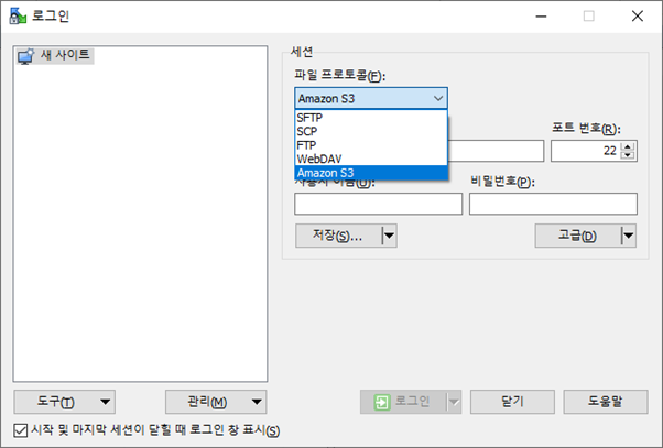 여기서는 일반적인 SFTP 사용을 위해 접속용 세션 설정정보를 입력 하고 [로그인] 버튼을 클릭합니다.