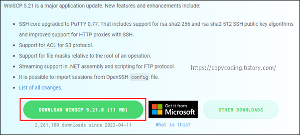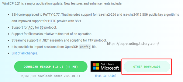 여기서는 [DOWNLOAD WINSCP]와 [OTHER DOWNLOADS] 두개의 버튼에 대해 설명합니다. 중간에있는 Microsoft 이미지는 마이크로소프트 스토어로 이동합니다.