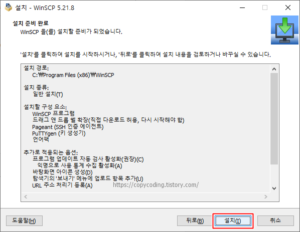 설정을 완료 하였다면 [설치] 버튼을 클릭하고 잘못 선택한 부분이 있으면 [뒤로] 버튼을 클릭해서 설정을 변경합니다.