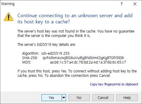 그리고 xxxx.key 파일을 선택해 주는데 WinSCP는 PuTTY에서 생성하는 키 형태를 지원하므로 변경을 하겠다고 합니다.