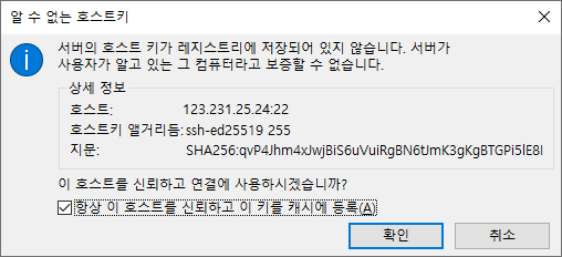 새로 접속하려는 사이트 연결 정보가 나오면 [확인] 버튼을 클릭 합니다.