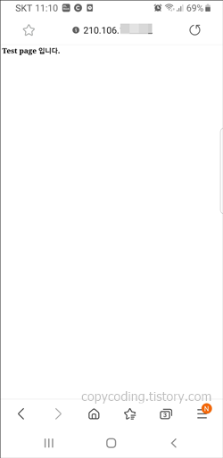 이번엔 원래 목적인 스마트폰에서도 똑같이 외부 IP를 사용해 http://210.106.XXX.XXX:9999/getTest 주소로 접속해 봅니다.