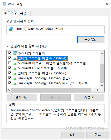 TCP/IPv4를 선택하고 [속성] 버튼을 클릭 하여